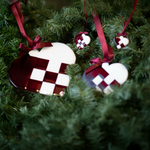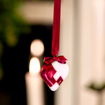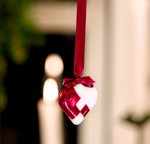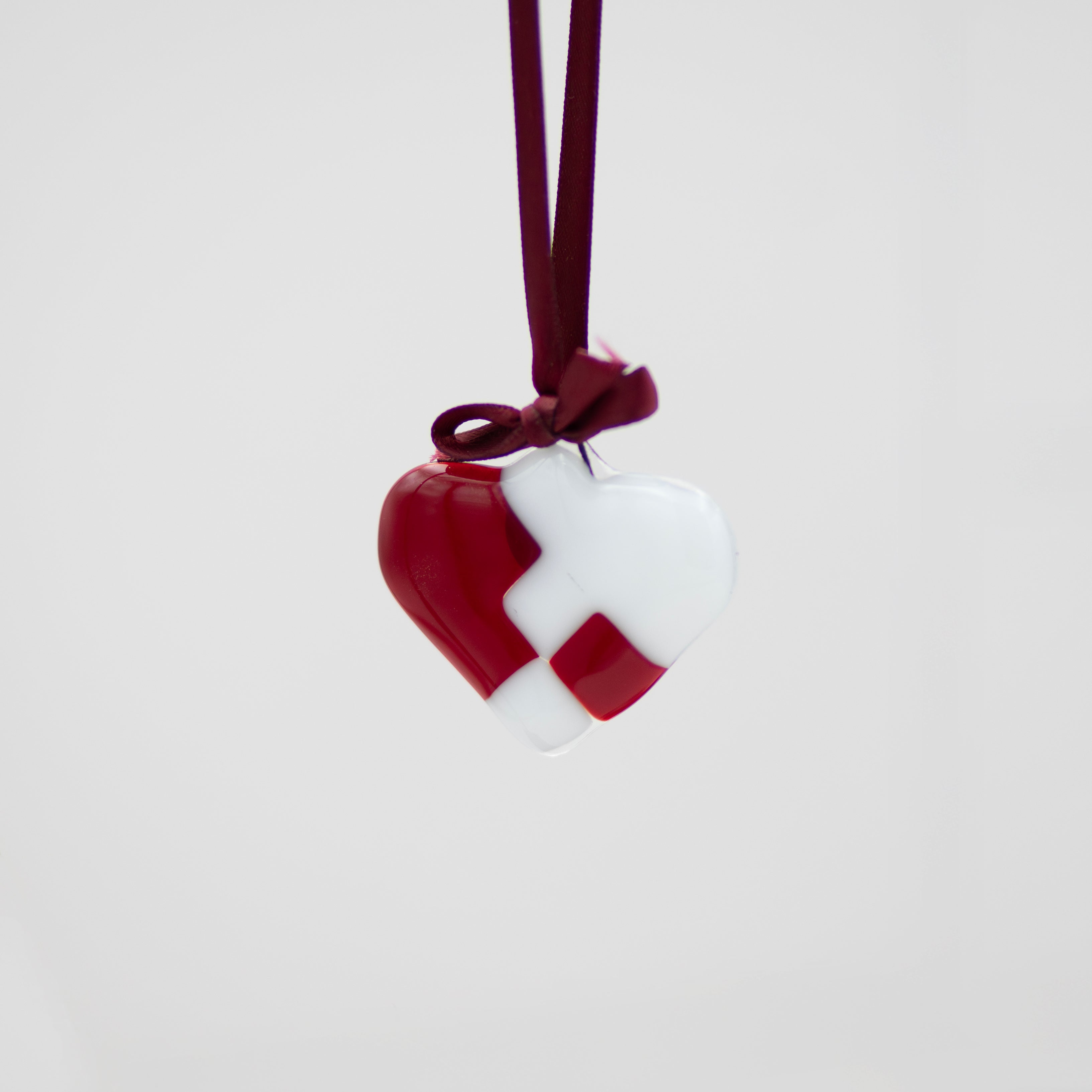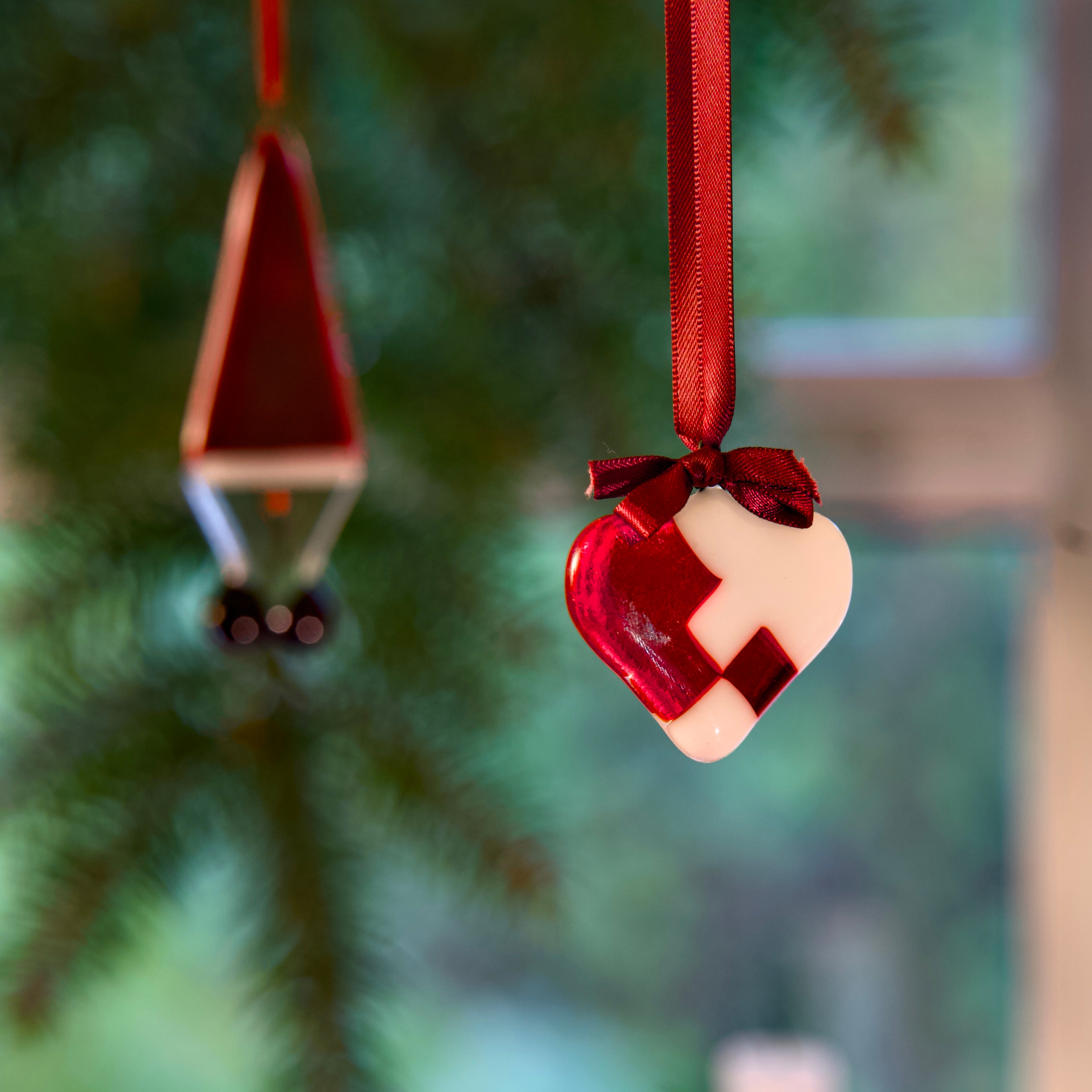 Perfekt håndlavet glasjulehjerte med flettet mønster – en klassisk juledekoration til træet, vinduet eller som en betænksom gave.