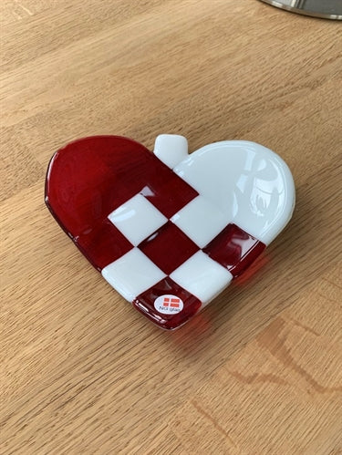 Et smukt håndlavet glasskål med klassisk dansk julehjerte-design – en perfekt kombination af tradition og elegance.